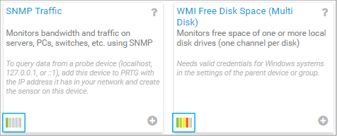 i_round_blueAlso consider whether a sensor’s performance impact is high or low. To do so, check the bar in the lower-left corner of the sensor box. For further information, see the Knowledge Base: How can I speed up PRTG—especially for large installations? (especially section 4 - Sensor Type and Monitoring).