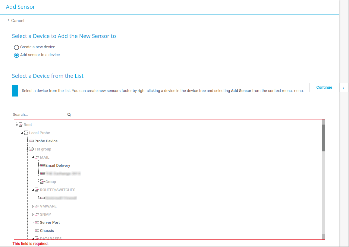 • Select Add Sensor from the context menu of a device to which you want to add the new sensor. This skips step 1 and leads you directly to step 2.