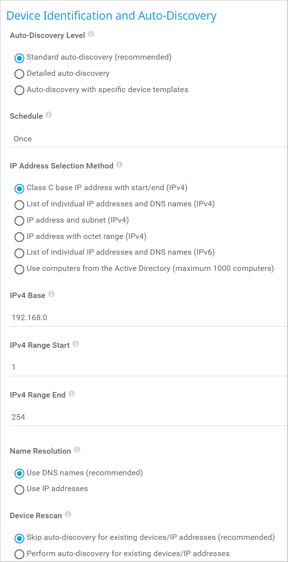 - Weekly: Run the auto-discovery for new devices and sensors every 7 days. The first auto-discovery runs immediately. All other discoveries start at the time that you define in the Monitoring settings, section Auto-Discovery.