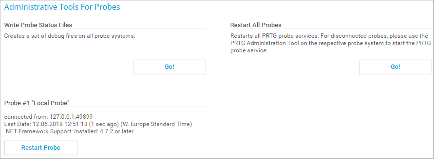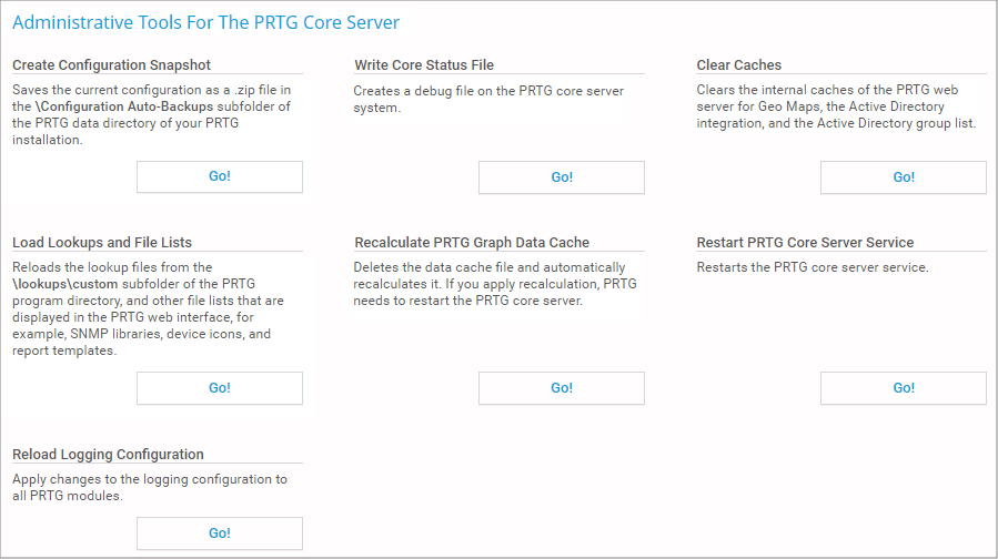 If you restart the PRTG core server service, all users of the PRTG web interface, of PRTG Desktop, or of the PRTG apps for iOS or Android are disconnected. Clicking Go! immediately restarts the PRTG core server service.