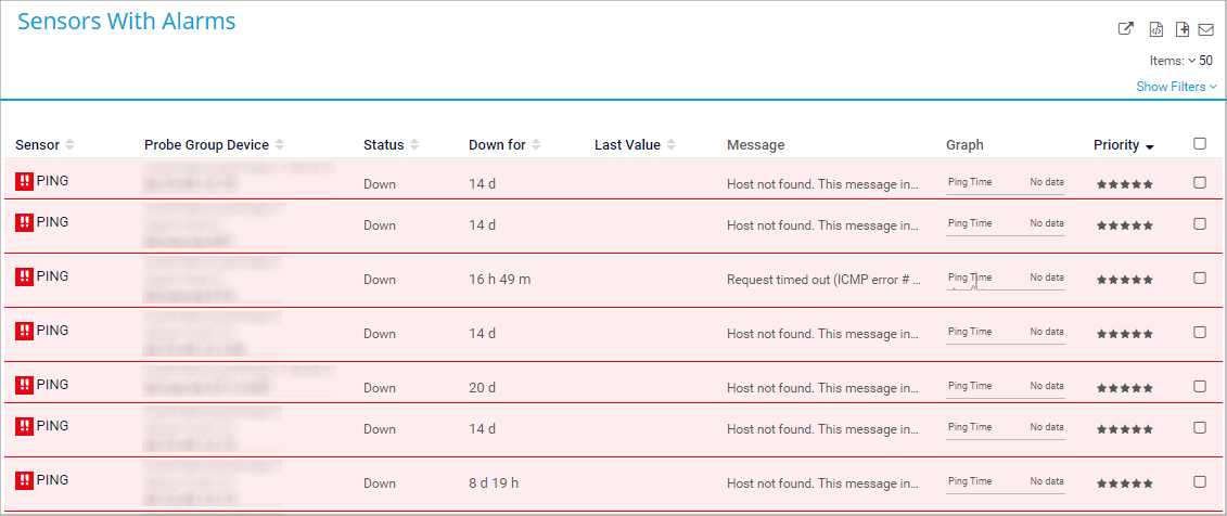 Click the Alarms tab of a probe, group, or device to show a table list of all sensors on the selected object that show the Down, Down (Partial), Down (Acknowledged), Warning, or Unusual status. This list is a subset of the entries that are available via the Alarms | All option in the main menu bar.