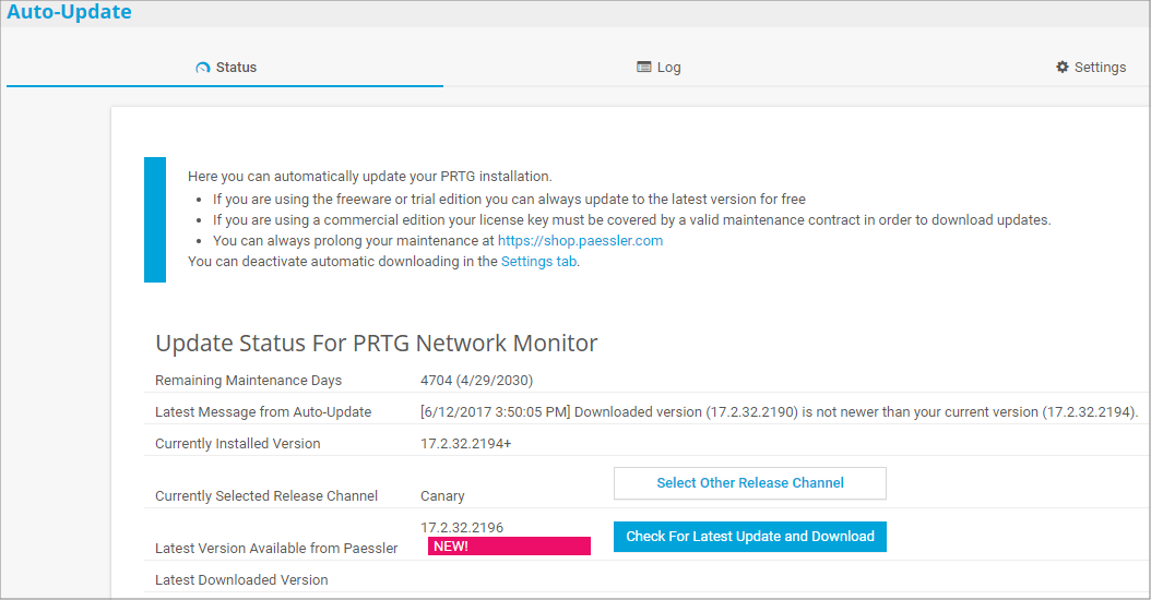 - PRTG does not start auto-update downloads if less than 500 MB disk space is available on the PRTG core server system. If this is the case, you can check this on the Log tab.