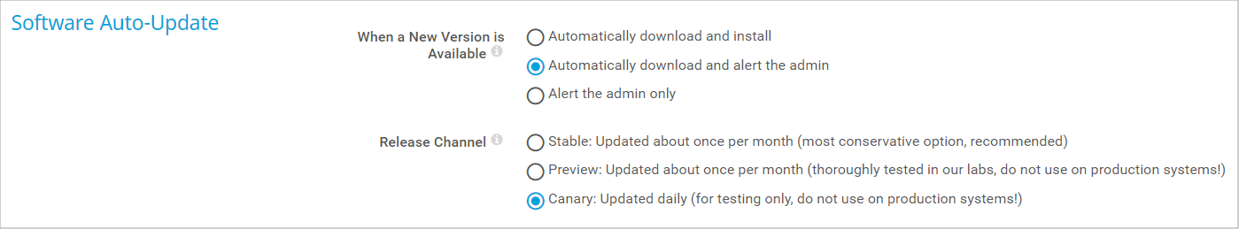 - Settings: Click the Settings tab to configure the auto-update and release channel. See Software Auto-Update below.