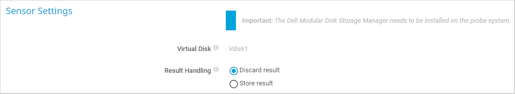 This sensor requires the installation of the Dell Modular Disk Storage Manager program. You must install it on the probe system (on every cluster node, if on a cluster probe). For details about setup, see section More below.