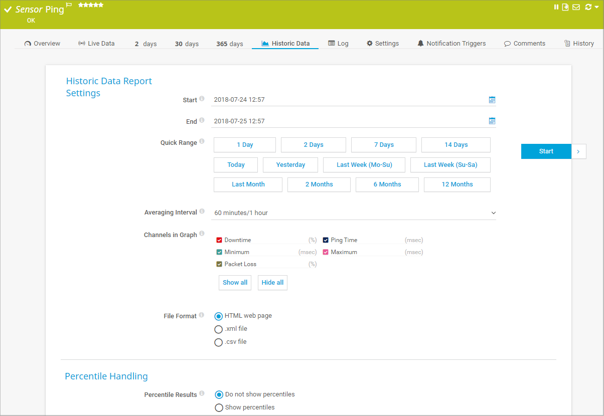 - Show percentiles: PRTG displays an additional percentile calculation for the primary channel in the value table for each scanning interval.