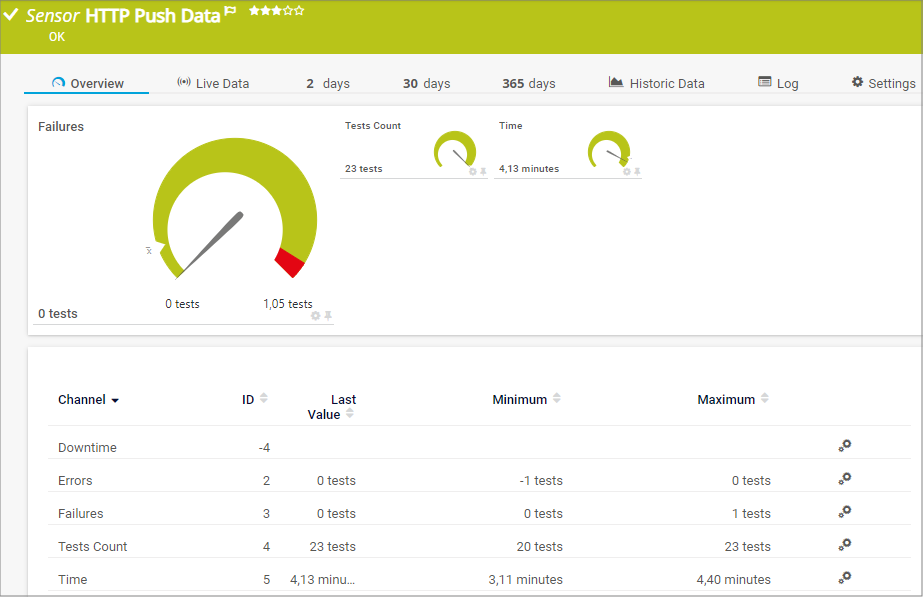 The HTTP Push Data sensor displays numeric values from received messages that are pushed via an HTTP request to PRTG. It provides a URL that you can use to push messages to the probe system via HTTP (secured with TLS 1.2 or not secure).