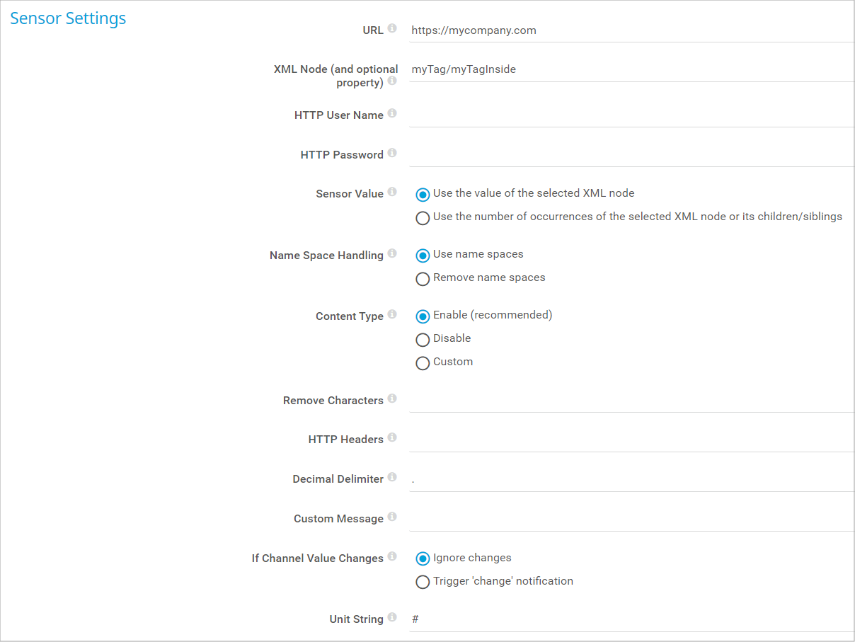 This setting is only visible if you select Use the value of the selected XML node above. If the sensor value of the returned XML node is of the type float, you can define any character as the decimal delimiter. Enter one character or leave the field empty.