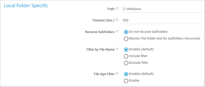 Enter a timeout in seconds. If the scan of the folder takes longer, the sensor cancels the request and shows an error message. If two consecutive scans fail, the sensor shows the Down status. The default value is 300 seconds (5 minutes).