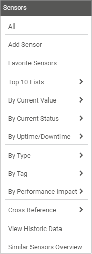 Open a list of sensors filtered by different parameters. Hover over By Uptime/Downtime to show other options. Follow the menu path to view lists of all sensors sorted by