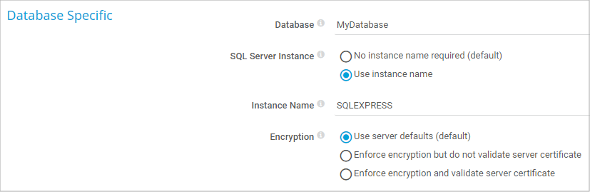 - Use server defaults (default): Only encrypt the database connection if the database server enforces encryption.