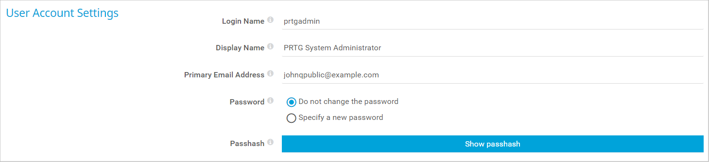 Click Show passhash to display the passhash for the user account. This is necessary for authentication for the PRTG API.