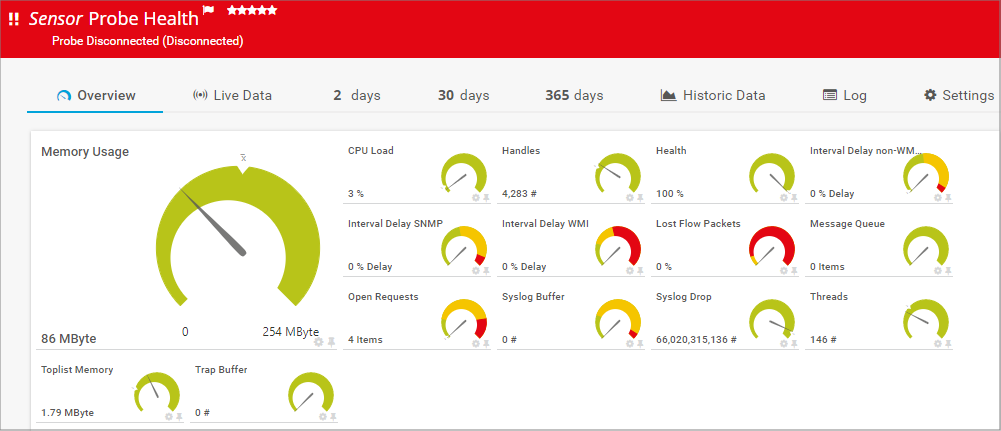 Alerts are an important part of monitoring that informs you when there are issues, when values exceed limits, or when a sensor status changes, for example. Some sensors display internal alerts in case of errors, for example, disconnected probes or socket and timeout errors. There are also sensors whose internal sensor alerts you can modify. To see if you can modify an alert, check the sensor's settings for customizable options.