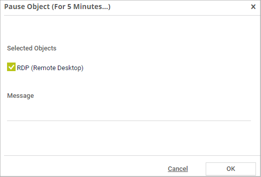 You can select Pause Indefinitely, or you can pause the object For 5 Minutes, For 15 Minutes, For 1 Hour, For 3 Hours, For 1 Day, or Until a specific date. If you select Until, you can additionally define a time period. Use the date time picker to enter the date and time. The object automatically resumes monitoring after this time period.