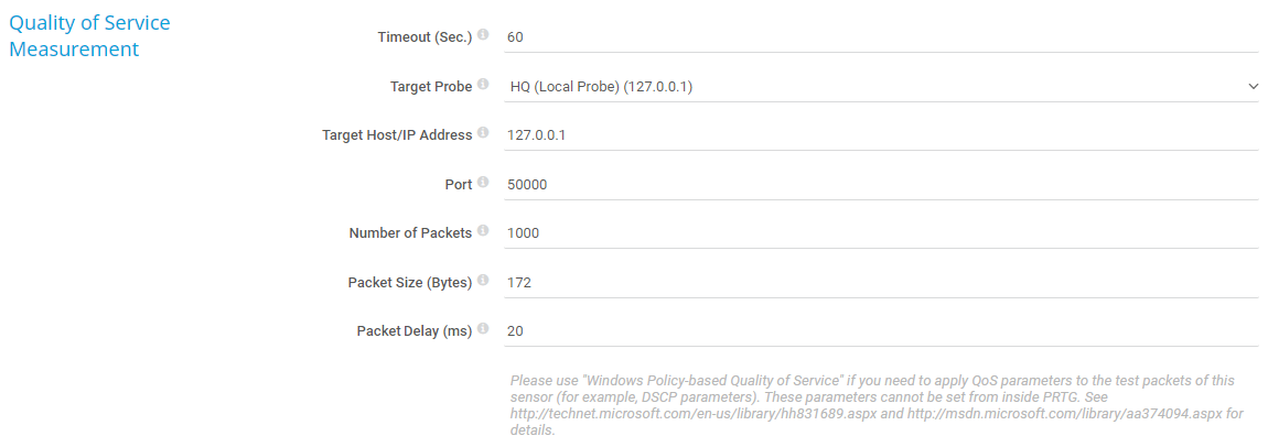 In PRTG Hosted Monitor, you can only select a different remote probe as the target probe. QoS measurements for connections to the hosted probe are not possible.