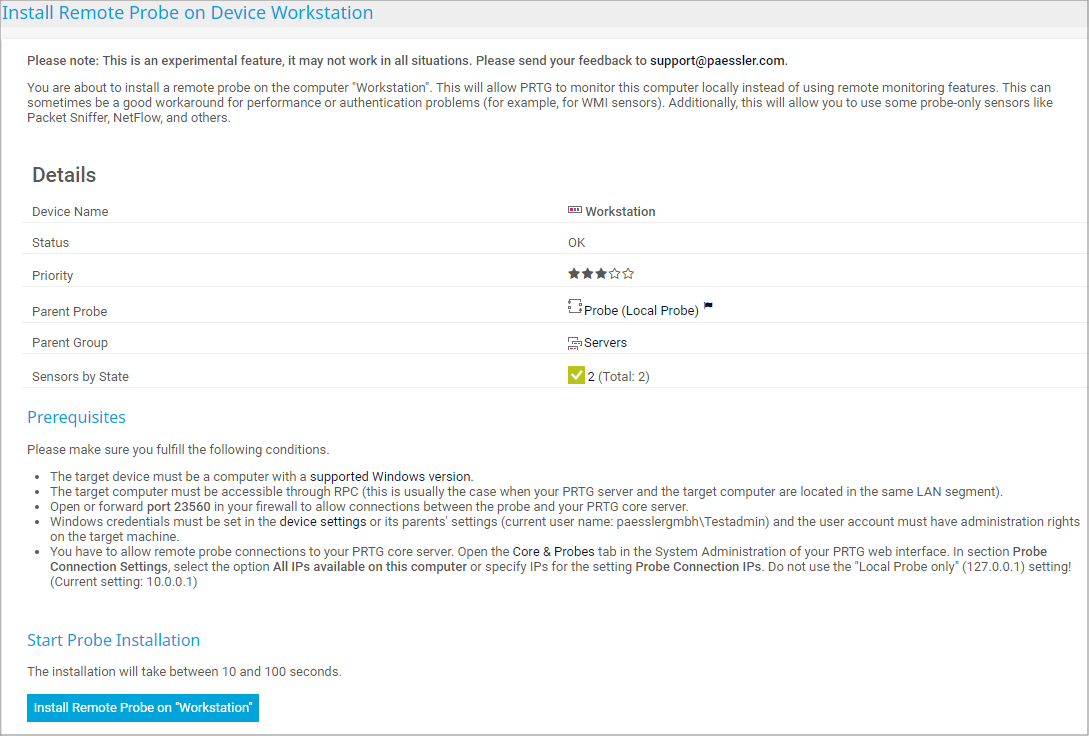 - Note that installing a remote probe directly from the device tree in the PRTG web interface is an experimental feature. This approach might not be possible in all situations.