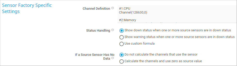 - Show warning status when one or more source sensors are in down status: If at least one source sensor that you use in a channel definition is in the Down status, the Sensor Factory sensor shows the Warning status until all referred sensors leave the Down status.