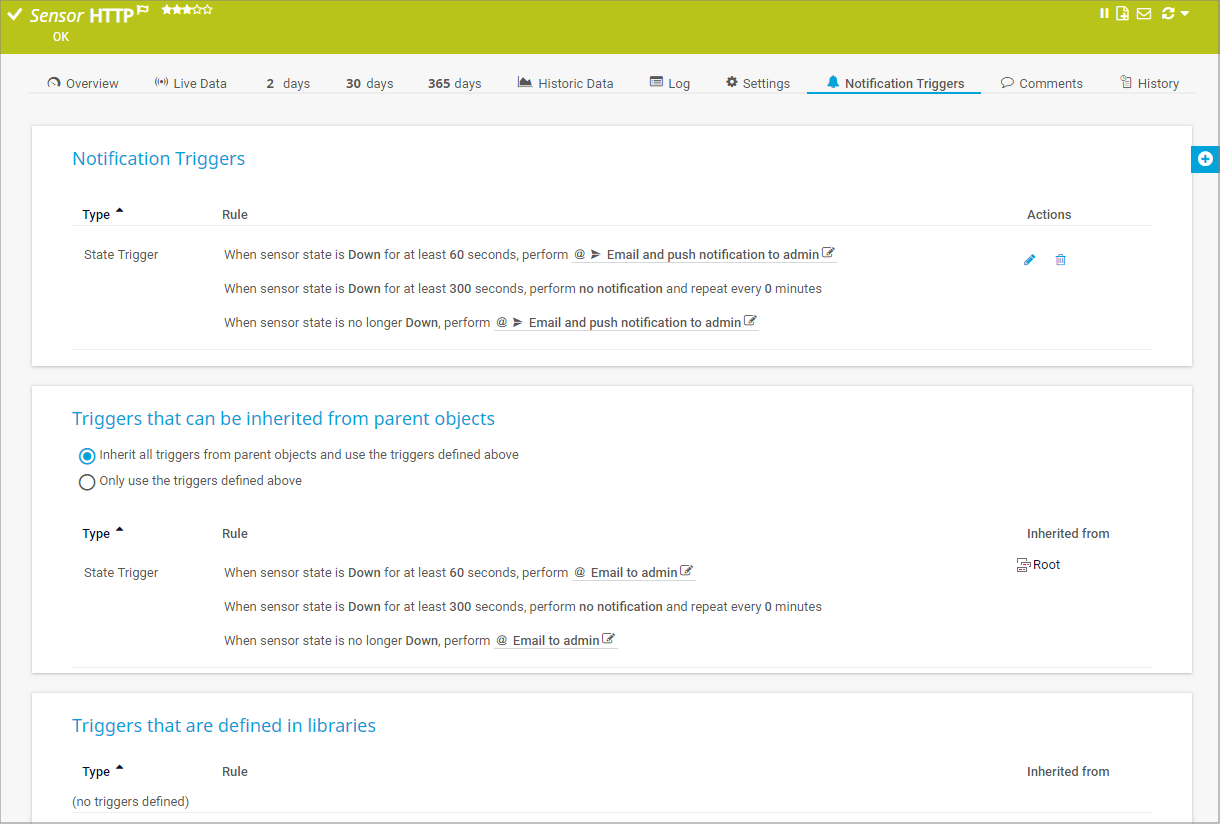 You can also define notification triggers in libraries. If a sensor is in a library that has notification triggers, the sensor shows them on the Notification Triggers tab.