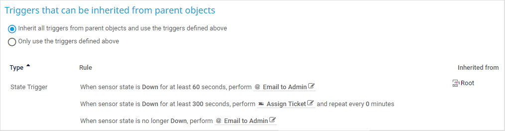 - Inherit all triggers from parent objects and use the triggers defined above: Use the inherited notification triggers in section Triggers that can be inherited from parent objects and use the specific triggers for this object in section Notification Triggers. To change settings of the inherited notification triggers, click the name of the monitoring object in the column Inherited from to open its Overview tab and then open the Notification Triggers tab.