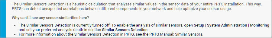 i_round_bluePRTG does not show the Similar Sensors section when the analysis is disabled or when you exceed 1,000 sensors and select the Manage automatically based on sensor count (recommended) option as Analysis Depth in the Monitoring settings. In this case, you see the following notice: