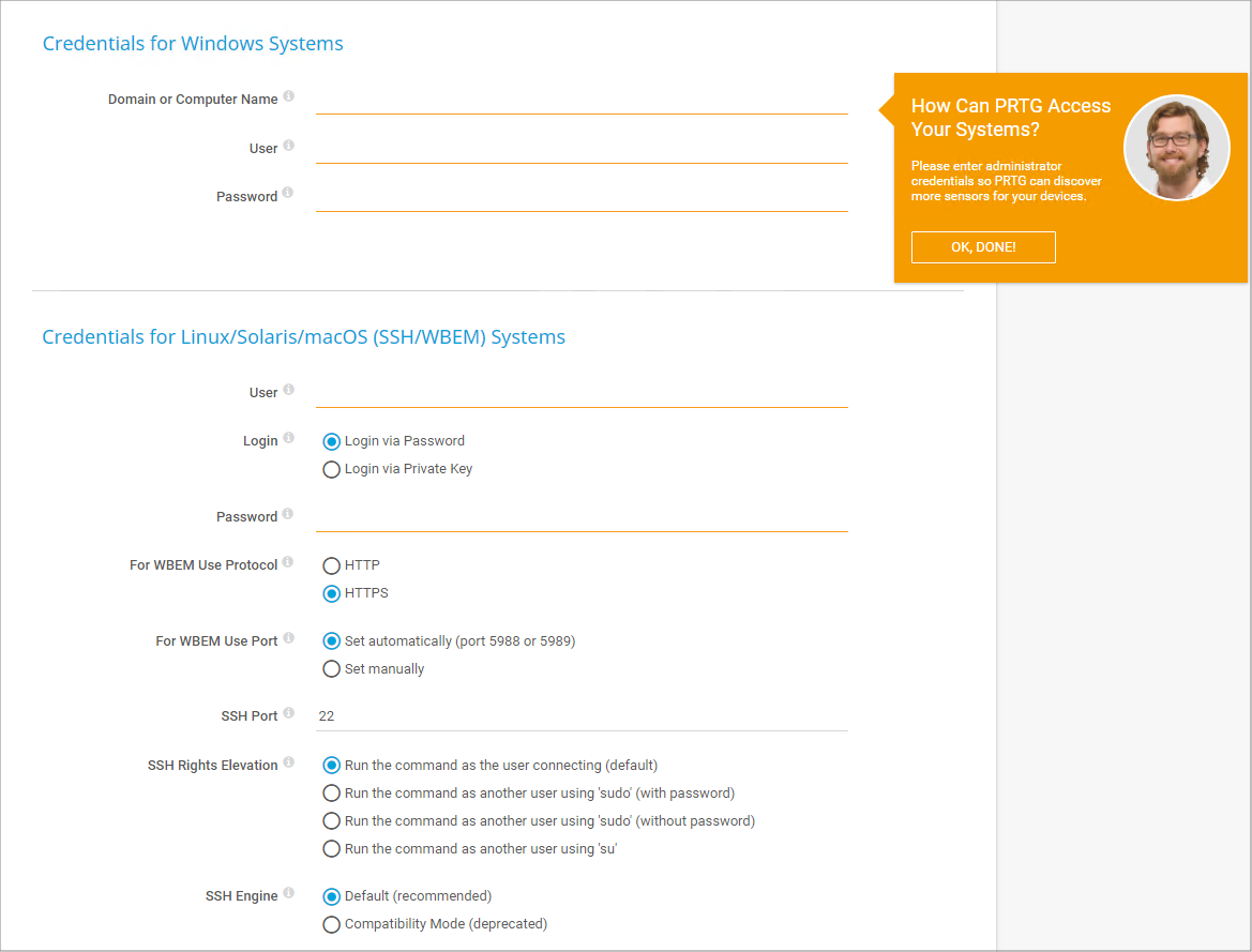 - If you have systems that run on Linux, Solaris, or macOS, enter root access credentials for these systems. For a general introduction to Secure Shell (SSH) monitoring, see section Monitoring via SSH.