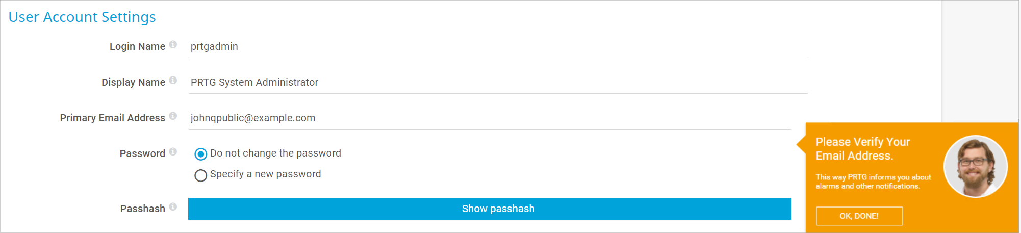 A correct email address is mandatory for PRTG to reach you via email notifications when there are alarms and for other important messages.