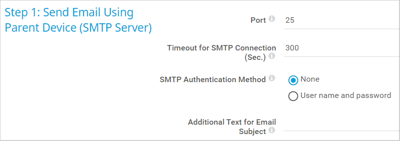 In this step, you configure how the sensor sends the emails. The sensor uses the IP Address/DNS Name of the parent device (an SMTP server).