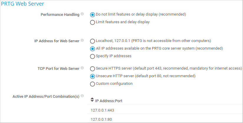 - Unsecure HTTP server (default port 80, not recommended): Use the PRTG web server without SSL/TLS on port 80.
