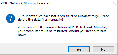 After the system restart, the software is removed, but there is still some custom data in the PRTG program directory. If you have uninstalled an entire PRTG installation or a remote probe installation, your monitoring data is still stored on the system. To completely remove all PRTG data, delete the PRTG Network Monitor folder as well as the Paessler\PRTG Network Monitor folder in the PRTG data directory.