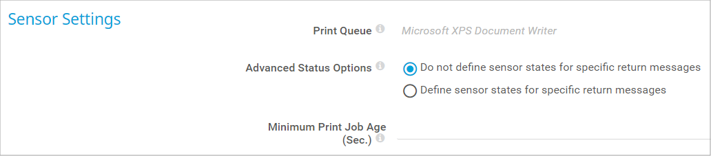 Optionally define the age of the print job in seconds. If you define a minimum print job age, the sensor does not regard jobs that are younger than this value. If you leave this field empty, the sensor does not check for the print job age. Enter an integer value or leave the field empty.