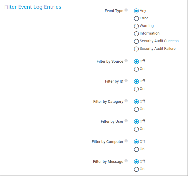 This setting is only visible if you enable Filter by Computer above. Enter a computer name that you want to filter for. Depending on the kind of filter, the sensor either processes the event computer (Include filter option) or it does not process it (Exclude filter option). Enter a string.