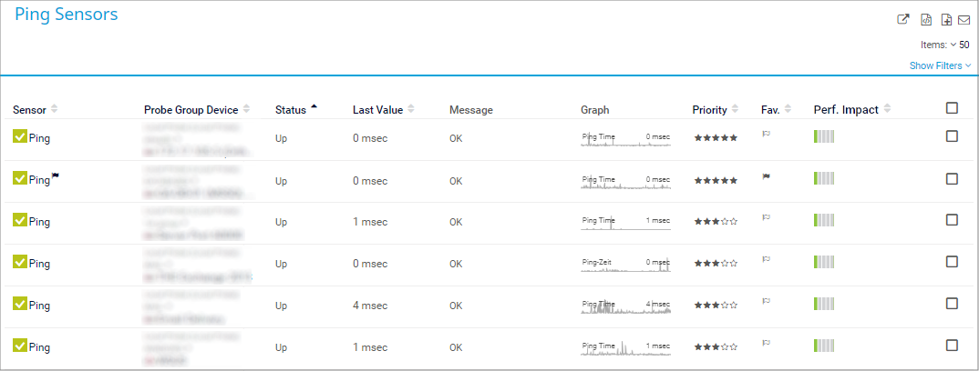 In the PRTG web interface, you often see table lists, for example, sensor or device lists. Table lists are also available in libraries, maps, reports, notifications, and schedules, as well as in logs and tickets. All of these table lists are similar in layout and functionality.